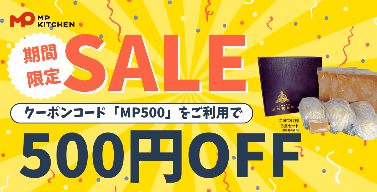 三田製麺所・渋谷餃子の公式通販ショップ『エムピーキッチンオンラインショップ』にて、2月1日(日)から3月31日(火)までの期間、公式オンラインショップにて利用できる「500円OFFクーポン」の配布キャンペーンを実施いたします。